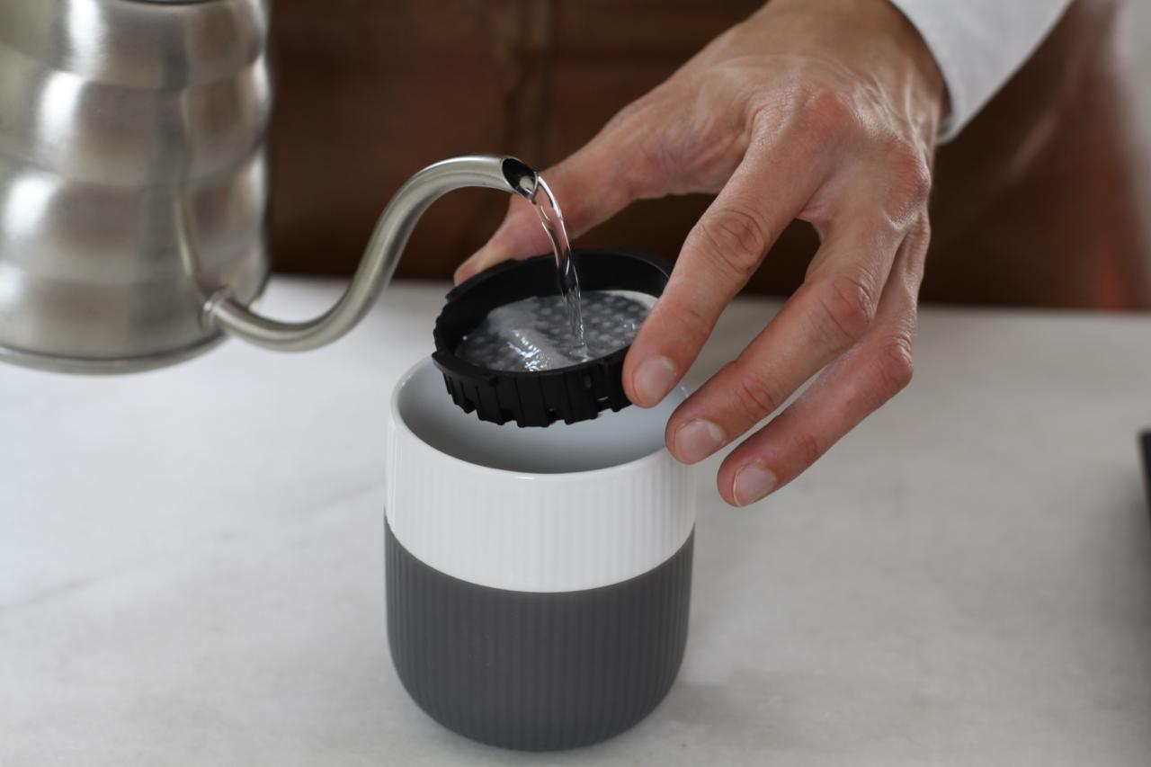 Fyll vann nesten helt opp og sett på filteret. Hvis du lager med vekt skal total vannmengde være 230 gram.