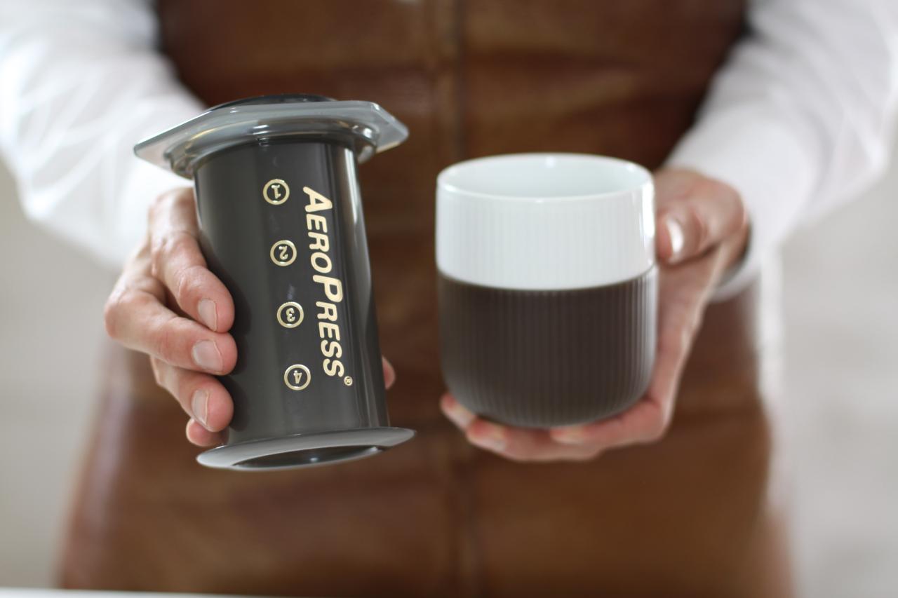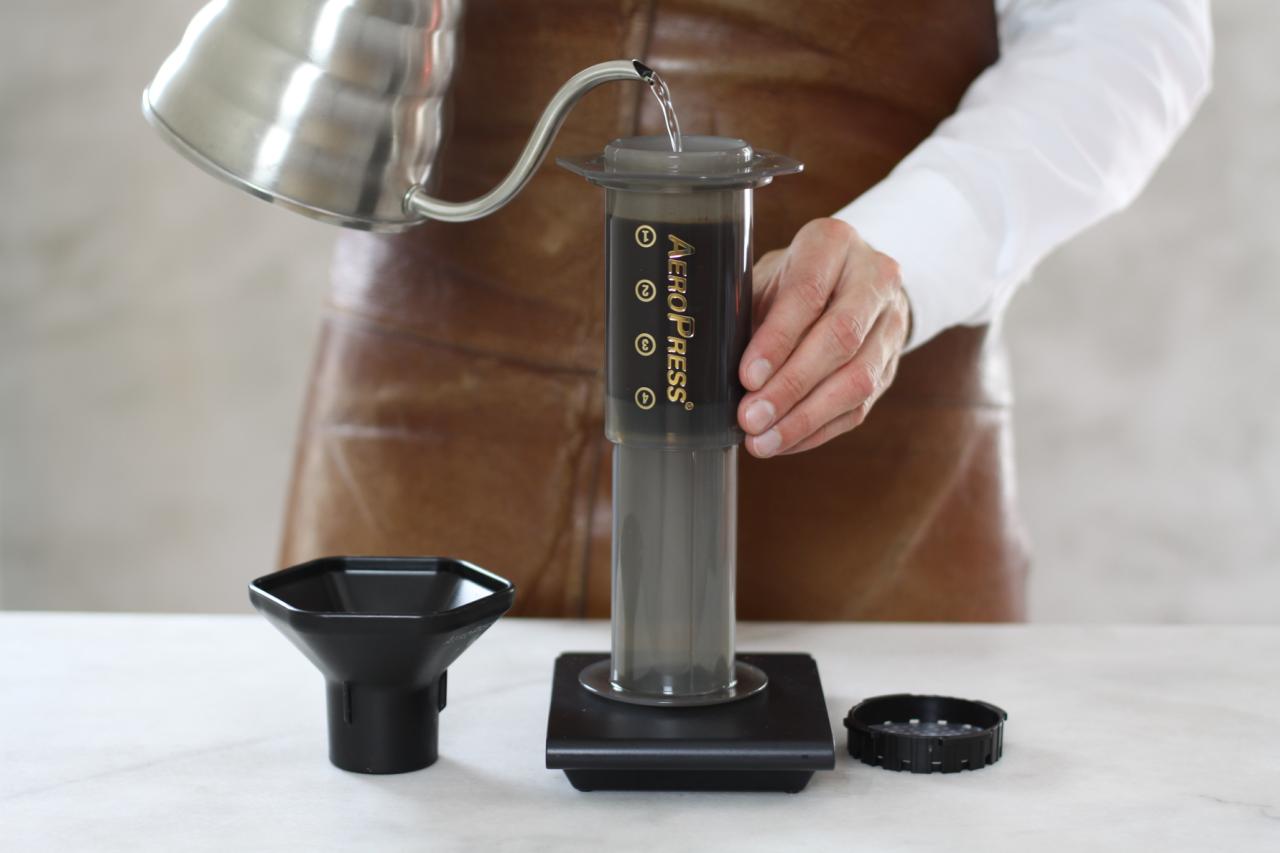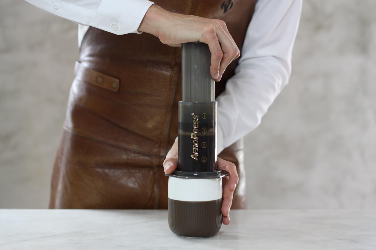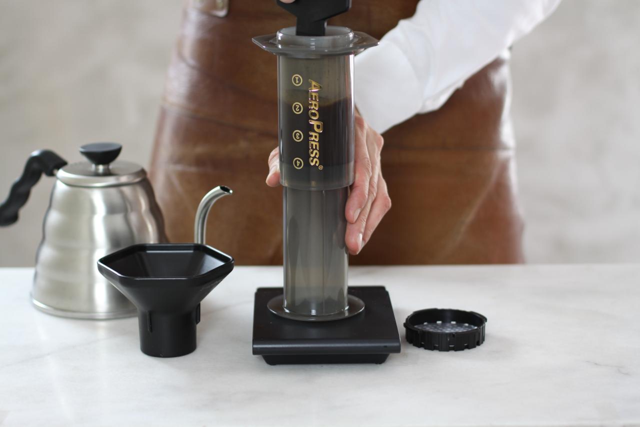 La kaffen brygge i 30 sekunder. Snu så bryggeren forsiktig rundt og plasser den på toppen av koppen. Trykk stempelet ned og stopp med engang du hører en hvislelyd. For den beste smaksopplevelsen bør du alltid bruke friskt vann, fersk kaffe og rent utstyr.