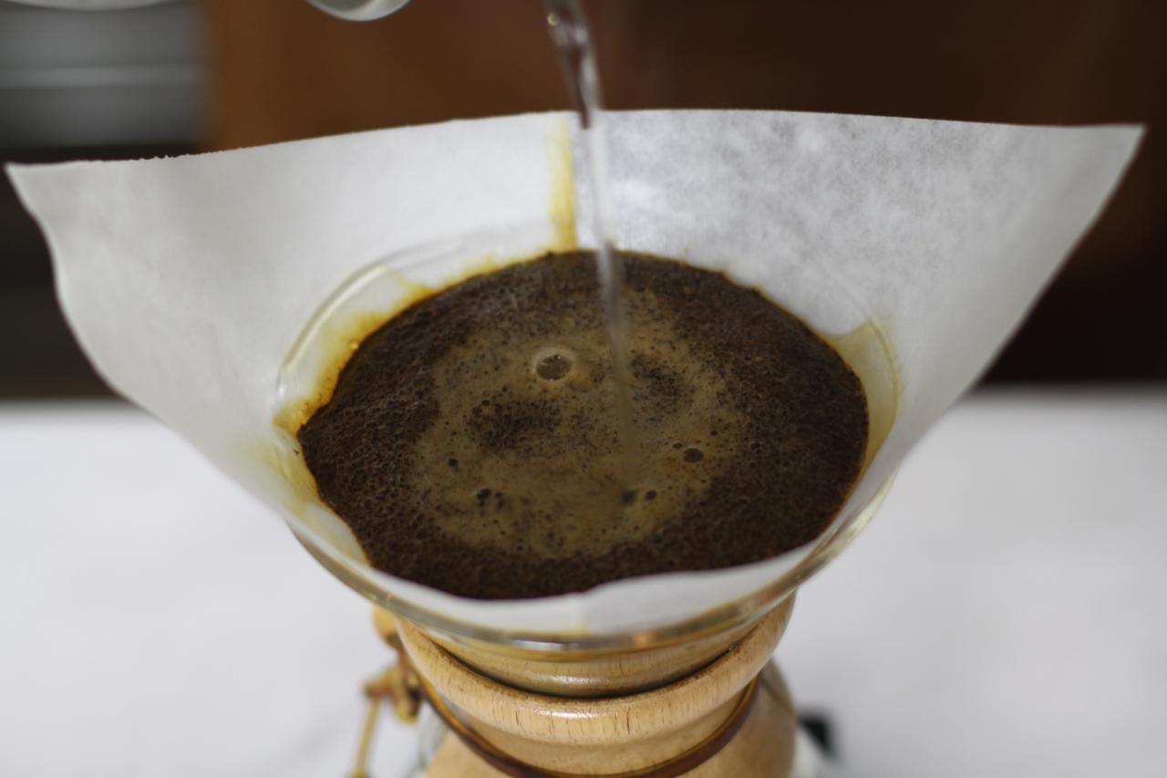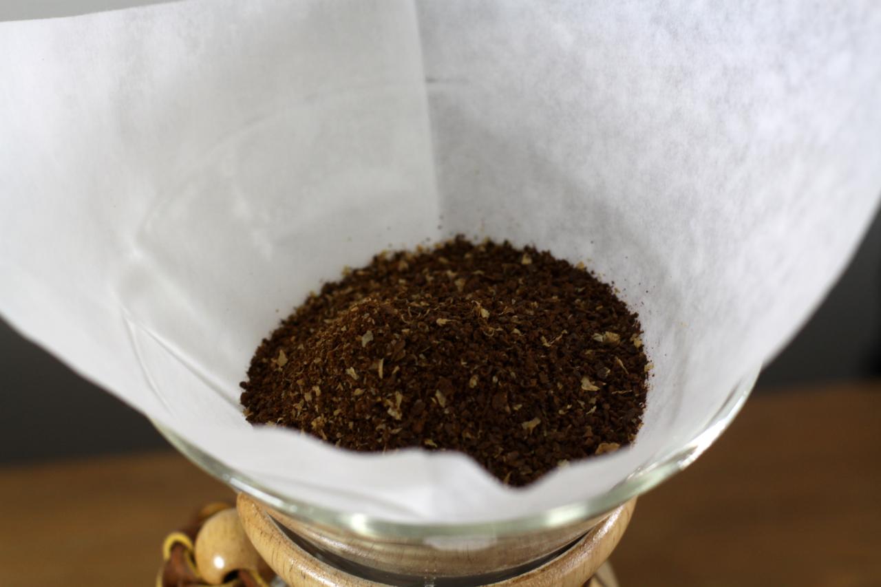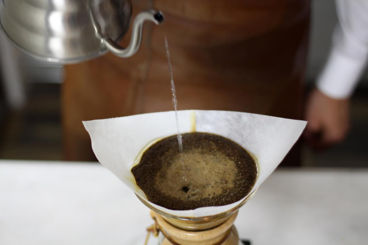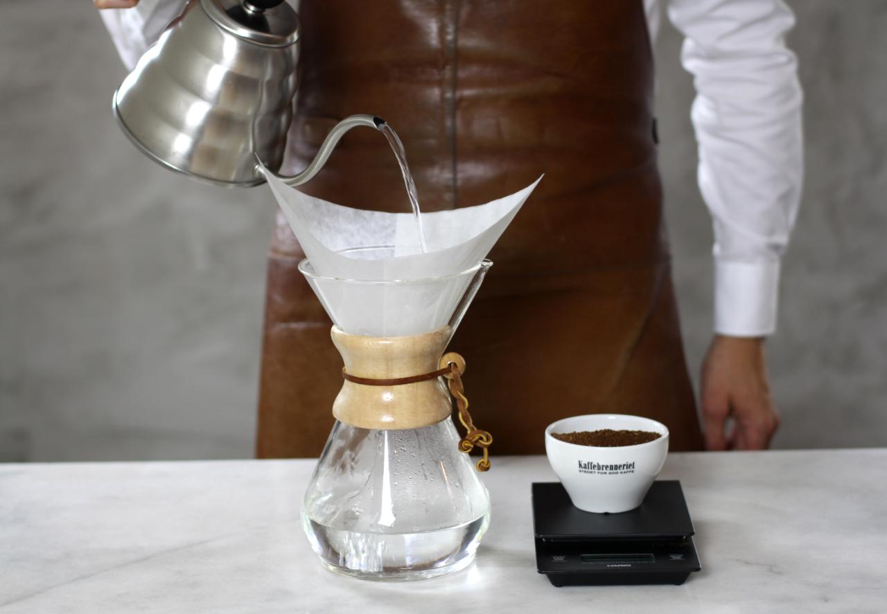 Hell ut vannet fra Chemexen og fordel kaffen jevnt i filteret. For den beste smaksopplevelsen bør du alltid bruke friskt vann, fersk kaffe og rent utstyr.