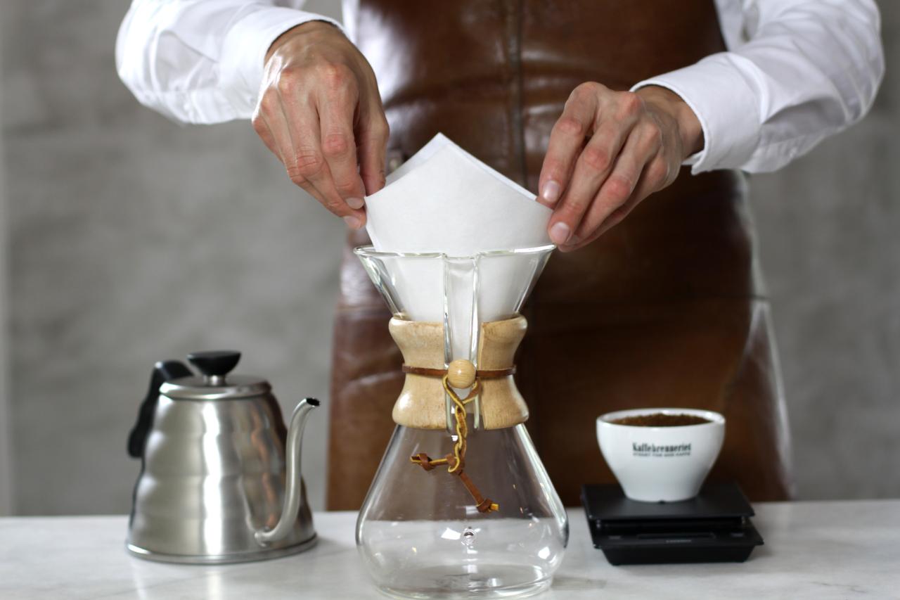 Plasser filteret med den tykke siden (dobbelt papir) mot helletuten på Chemexen.