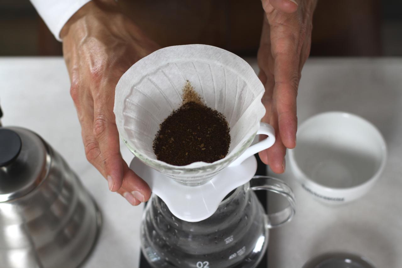 Hell i nymalt kaffe i håndbryggeren. Fordel kaffen jevnt i filteret.