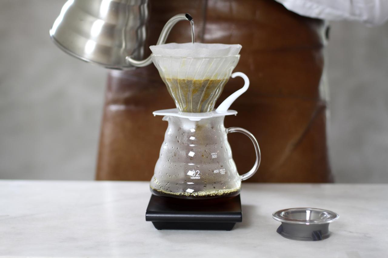 Hario V60 er en trakt som har en jevn rund form og et stort hull i bunn, noe som gir en jevn ekstrahering og en god smak i koppen. Vinkelen på bryggeren er 60 grader og den er formet som en V. Derav navnet V60.
