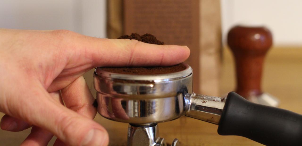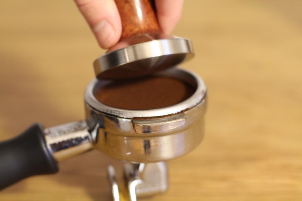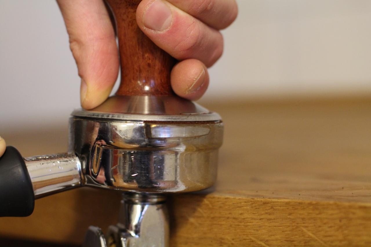 Tamp kaffen ned med et jevnt trykk. .