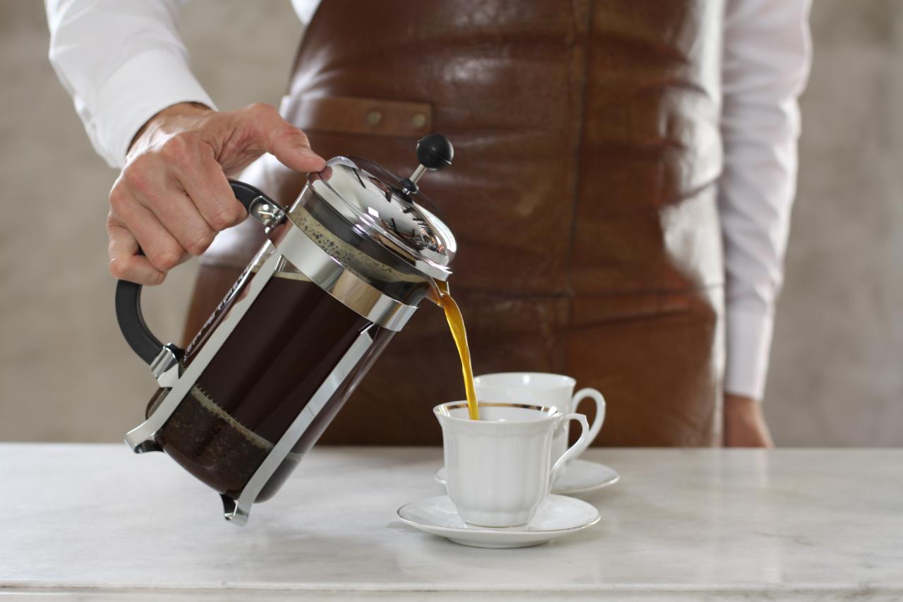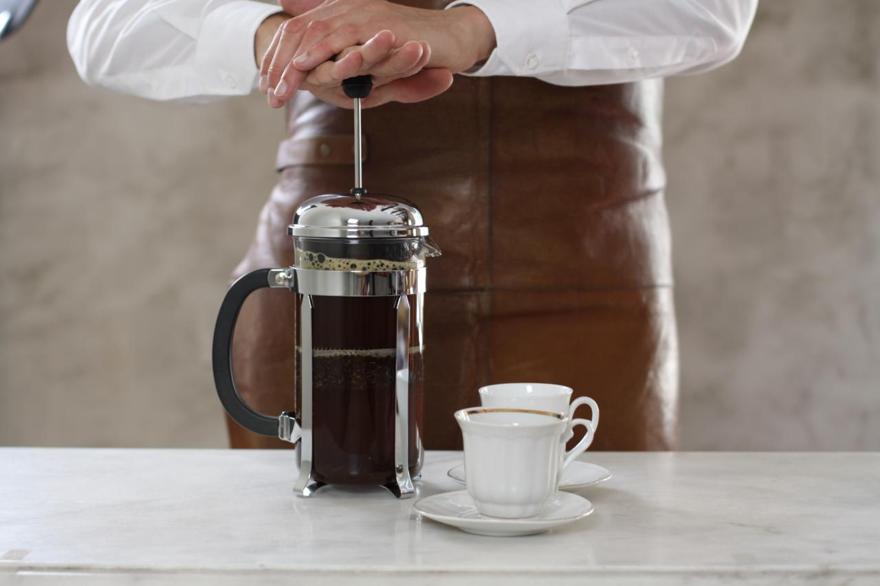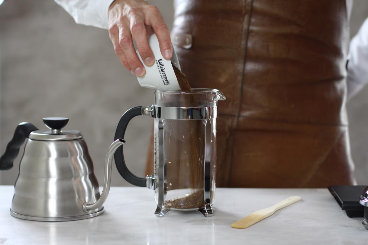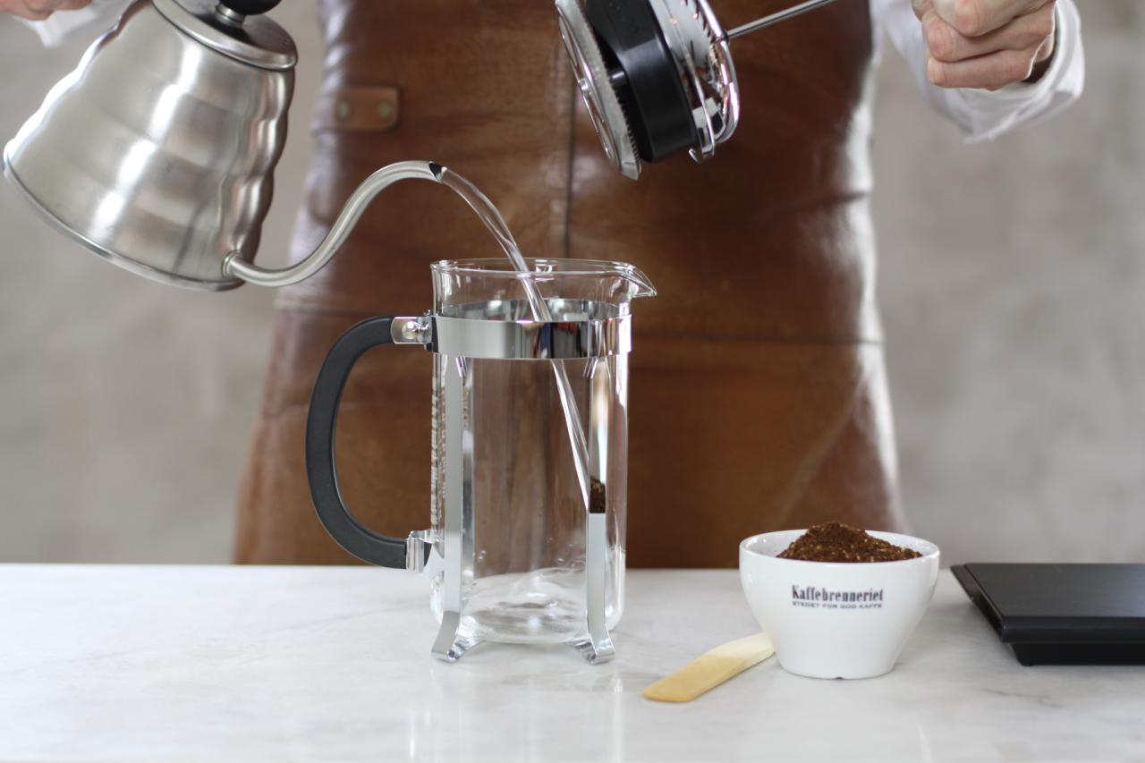 Hell ut det varme vannet og ha kaffe i presskannen. For den beste smaksopplevelsen anbefaler vi alltid å bruke nymalt kaffe.