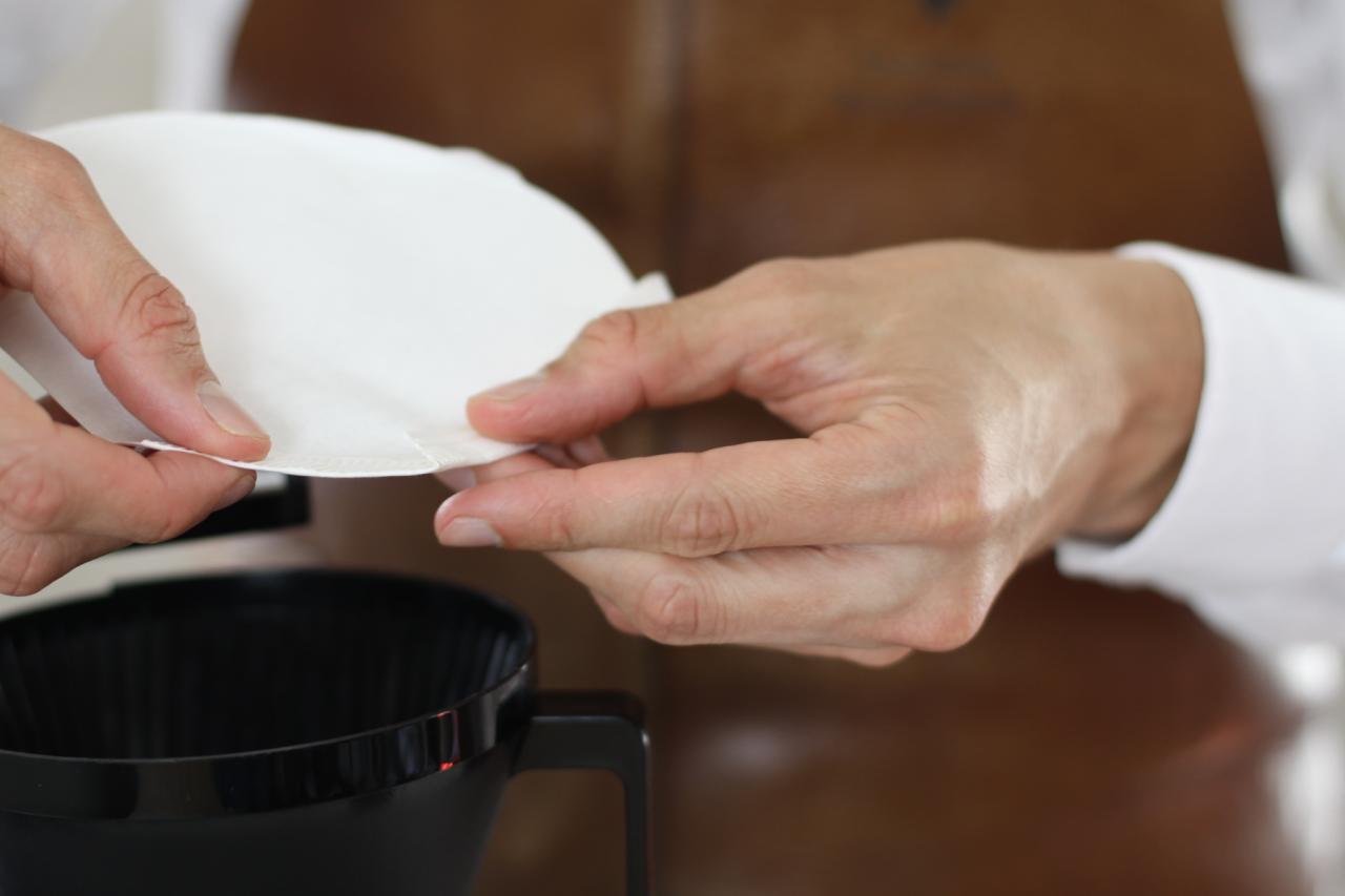 Brett og skyll filteret med vann som vist på bildet. Dette tar bort eventuelt papirstøv som kan sette smak på brygget.