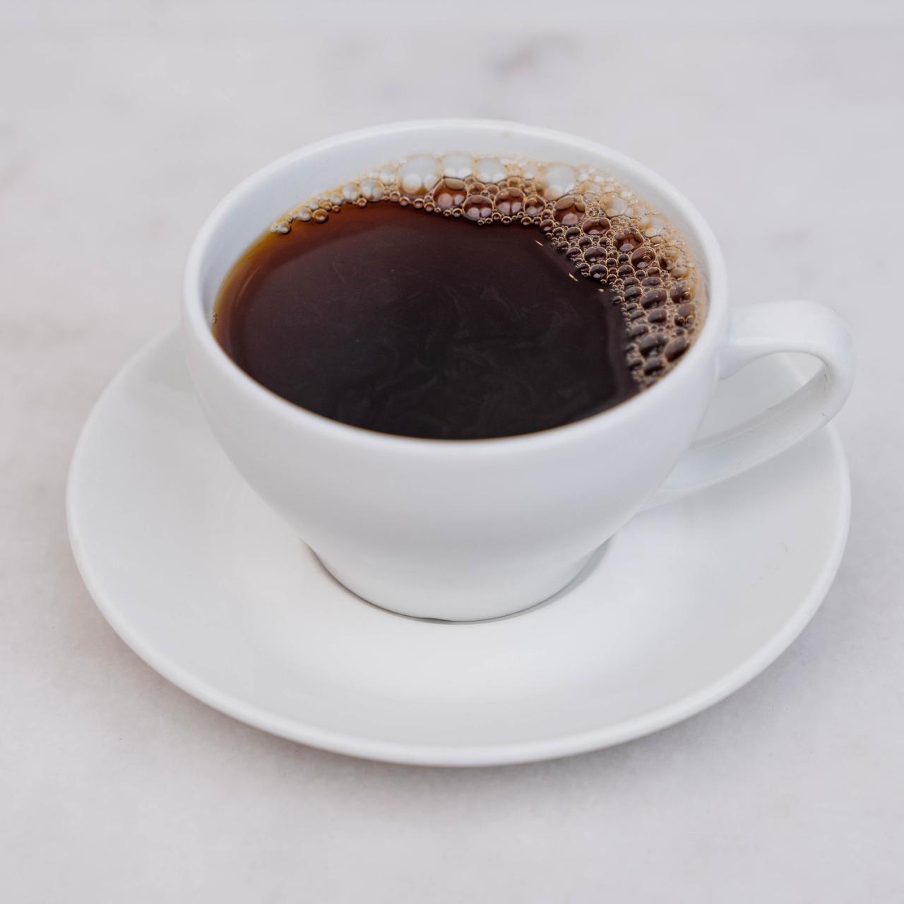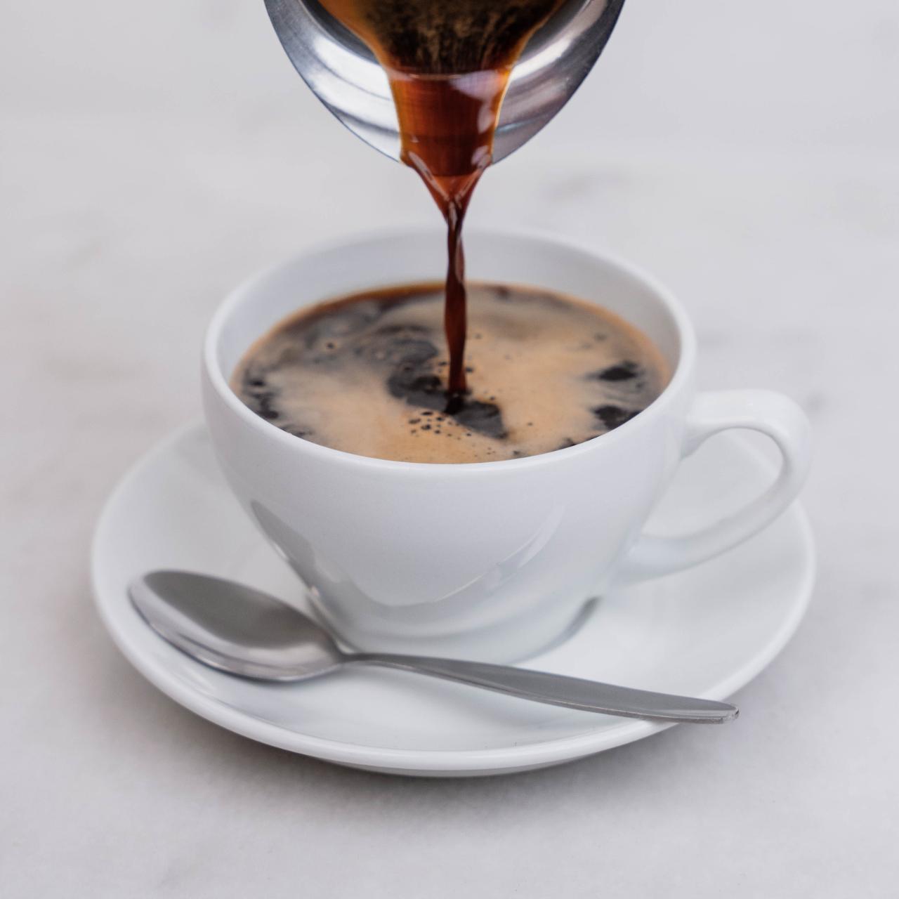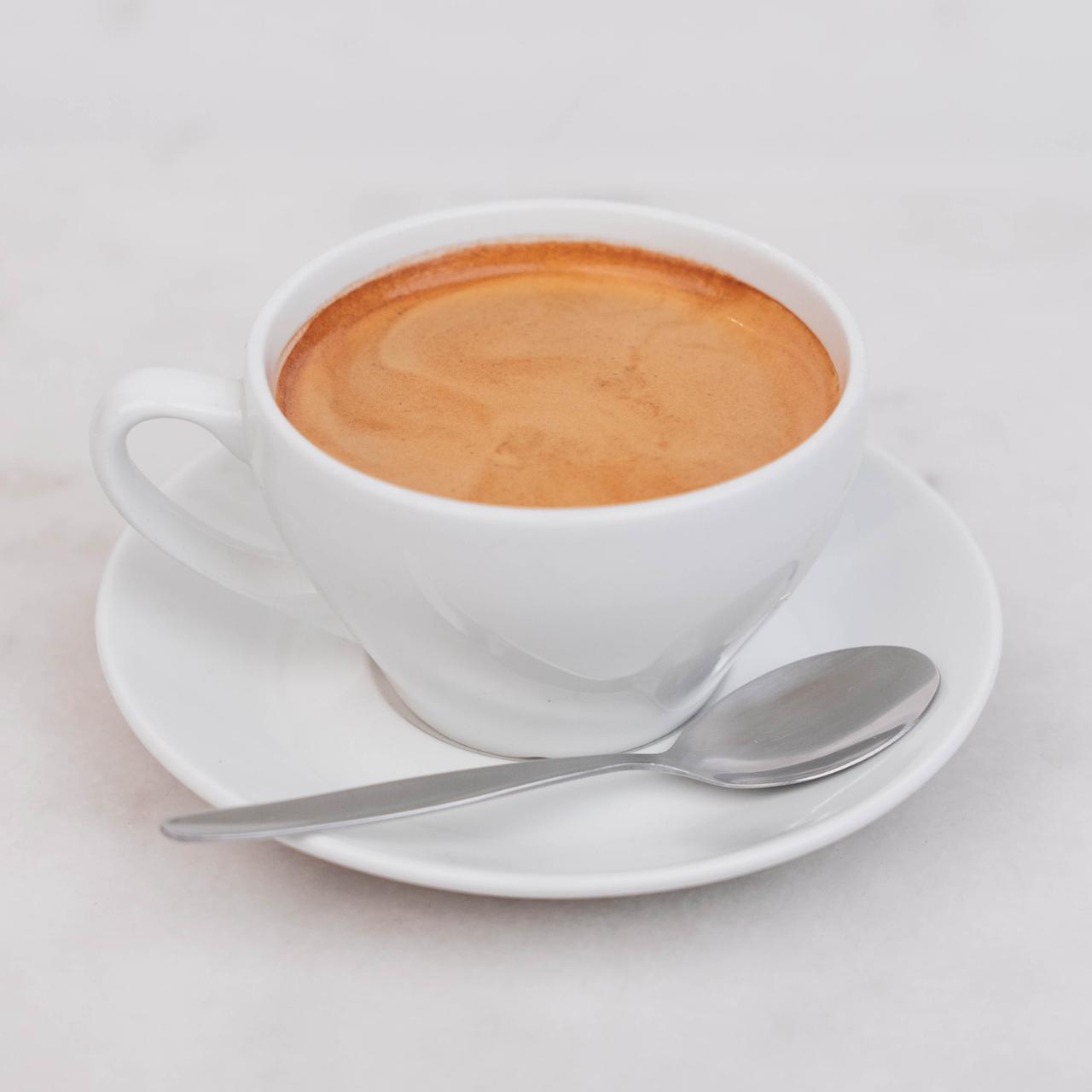 Vår egen oppkvikker: Enkel eller dobbel espresso i kaffekopp som fylles opp med Svart kaffe.