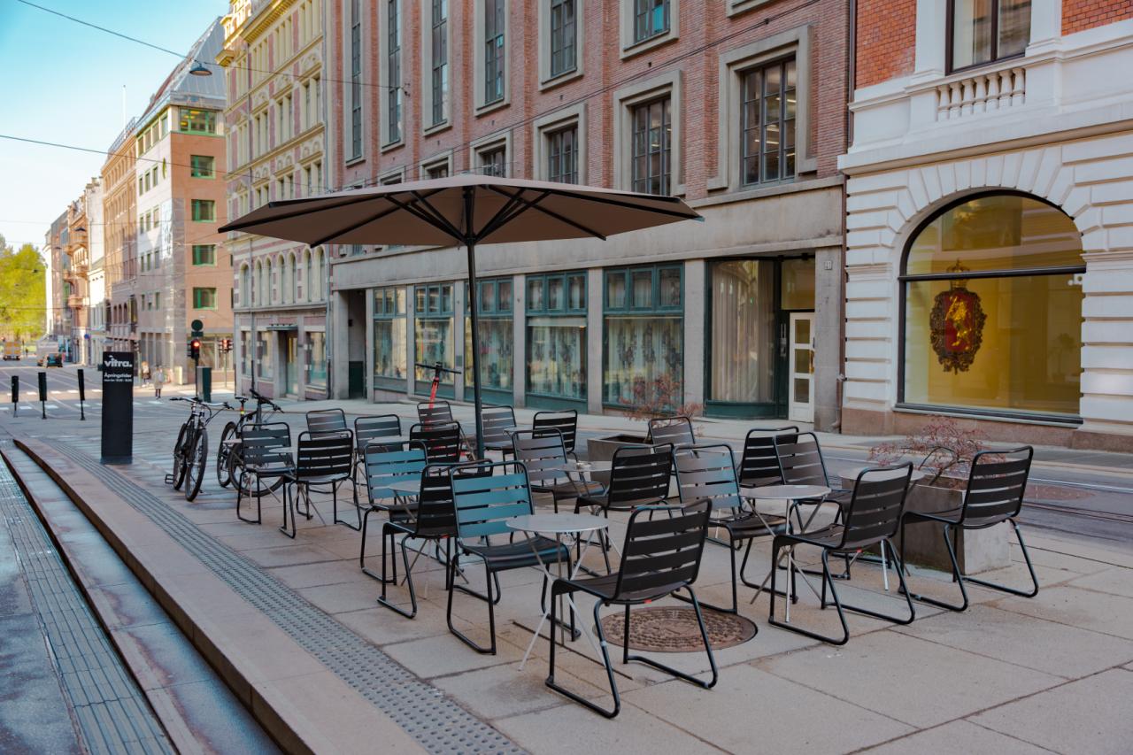 Akersgata er historisk, den har vært innfartsåre fra Festningen til gamle Aker Kirke og Akergårdene allerede fra 1300-tallet. Bygården vi er i, Akersgata 16, var kjøpesenter med cafe-bar allerede på 60-tallet, før den ble kontorisert i en lengre periode. Bygården har nå blitt pusset opp og endret tilbake til sitt uttrykk fra 1930-tallet da den ble endret etter byggeåret i 1895. Vi har videreført denne Art Deco stilen inne i vårt nå dobbelt så stort lokale. Rene linjer, larvikitt steinplater, art deco inspirert diskfront og egendesignede lamper med blåste glasskuler fra Glasshytta Blåst, møter deg i vår innbydende kaffebar. Fargen vi har valgt på øvre del av lokalet har fargekode 4010-G10Y. Fargen på nedre del av lokalet er 5010-G10Y.
