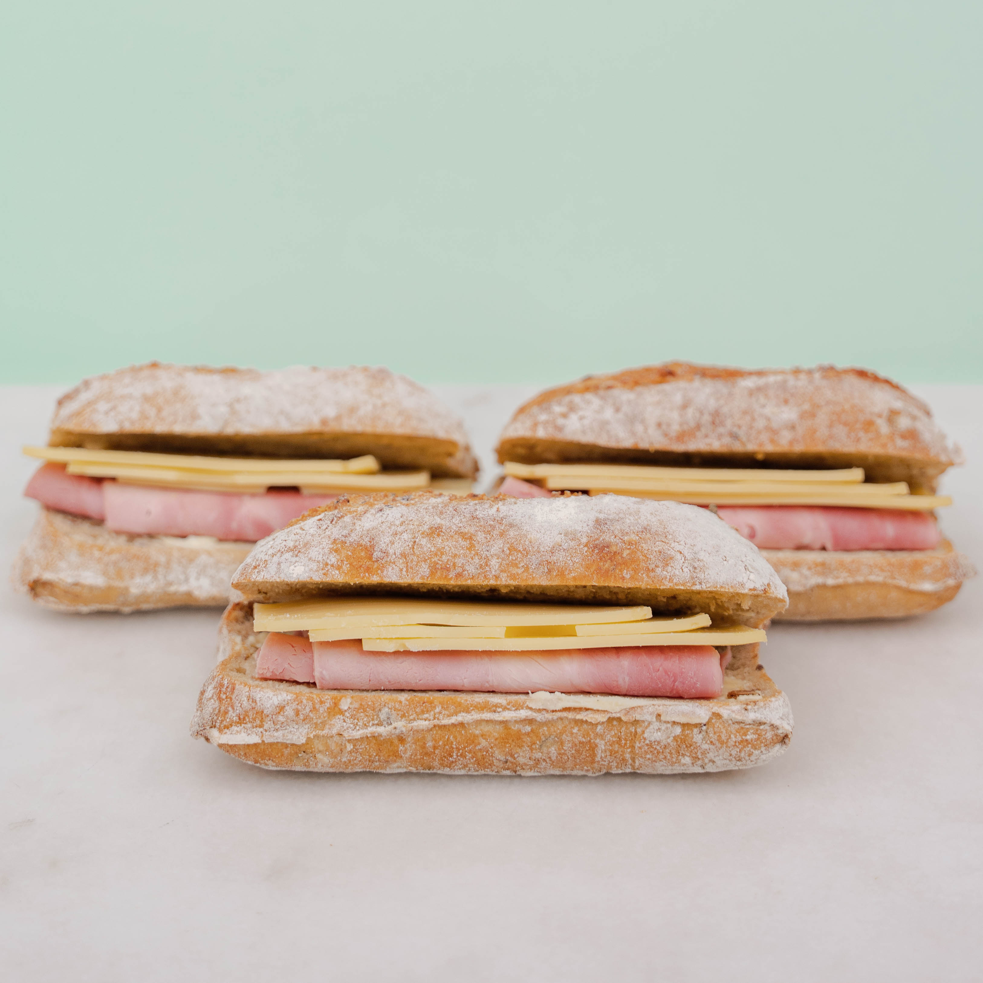 Torshovskinke fra slakteren Strøm Larsen og en langtidslagret Jarlsberg. Serveres på et grovt steinovnsbakt brød.